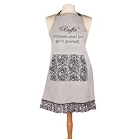 This is a very cute apron. Cute saying on the front with a ruffle around the bottom. I liked it because it isn't plain and is not a silly print with a bunch of kitchen objects on it. It is a gift for my 25 yr. old daughter who loves to cook and create. It is perfect.